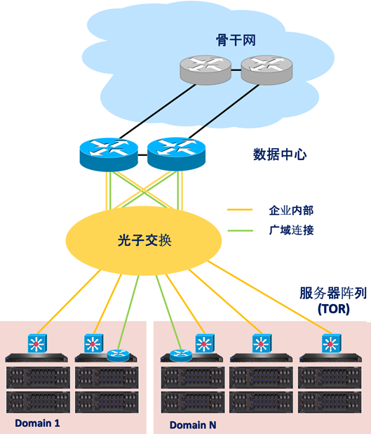 云计算数据中心应用 服务器的增加带来带宽的激增 由于富媒体和复合计算量的驱动 带宽每年以2倍到4倍的速度增长 接口规模 10-40-100 Gbit/s 光子交换的作用 适合 1-100+ Gbs 的透明互联 一定程度上摆脱对光传输设备的依赖 相对于带光口的以太网交换机,有最低的造价和最低的能耗 数据中心的防灾容错,带宽需求的变化,以及数据中心内各服务器之间的光路连接